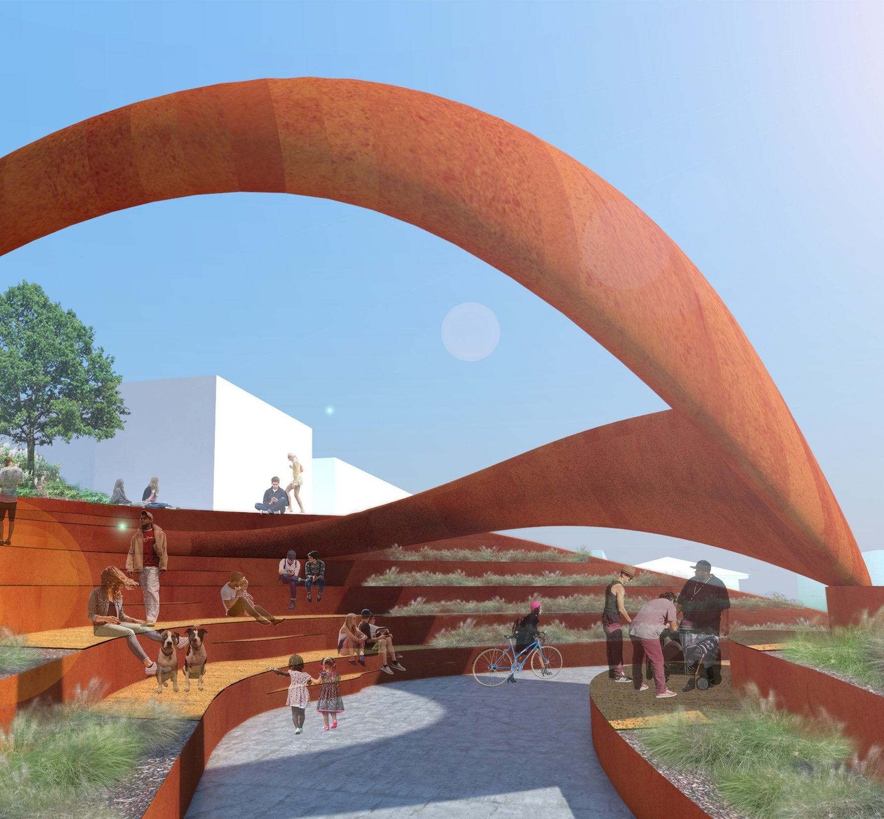 The piece will be constructed from weathering steel (Corten Steel) for three reasons. First in order to set up a material dialog with the Ptolemy’s Wedge sculpture on the library plaza by Beverly Pepper which is also made of weathering steel. Second to speak to the post-industrial condition of the contemporary American city. And lastly for practical reasons that the material is self-healing and self-sealing which is critical in this highly trafficked and high impact zone in front of the library.